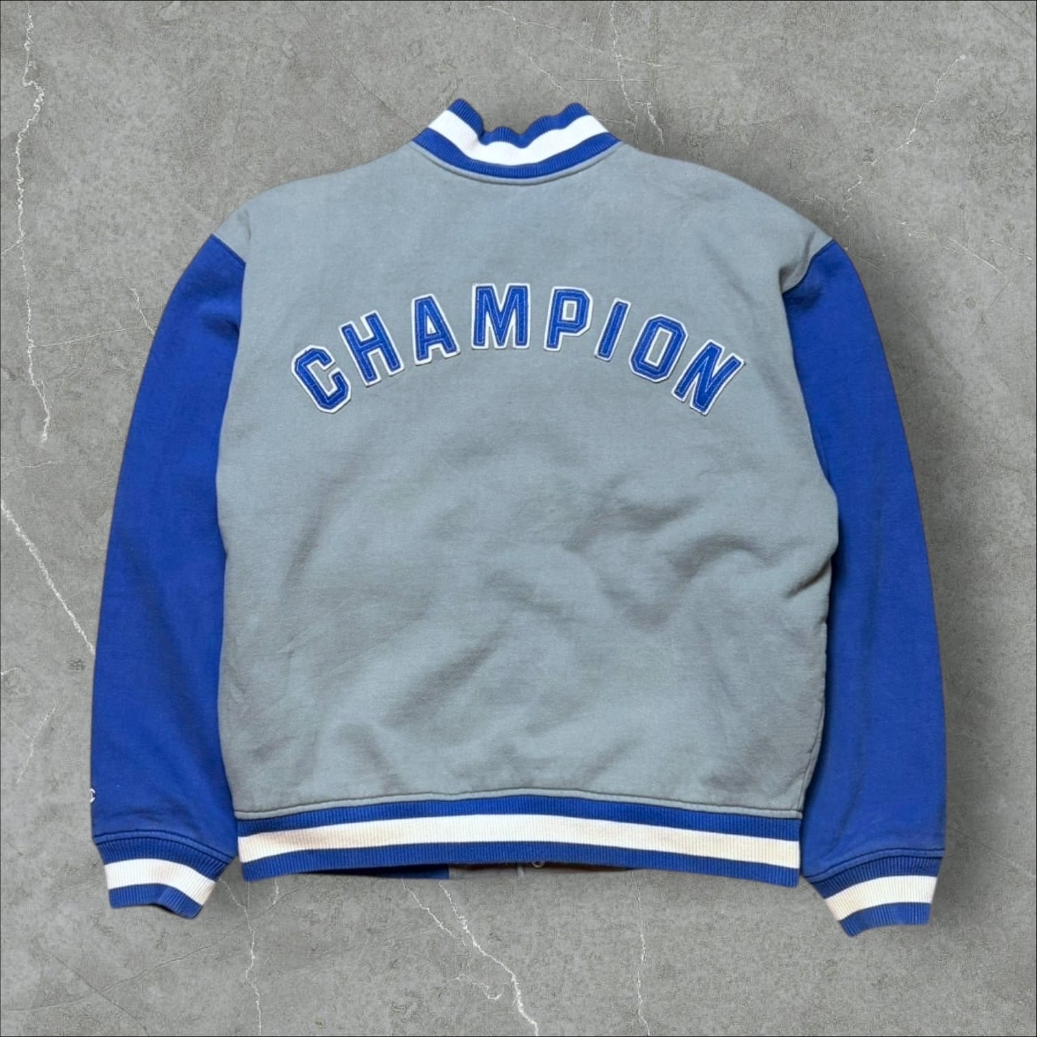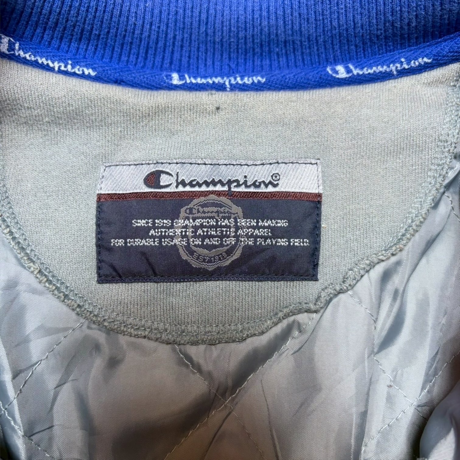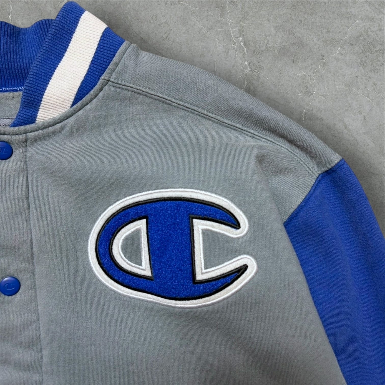 00's Champion SuperLetterman Jacket Grey × Blue L / Champion スーパーレターマンジャケット グレー × ブルー L スウェットスタジャン スタジャン デカ目 厚手 ヘビーウェイト 西海岸