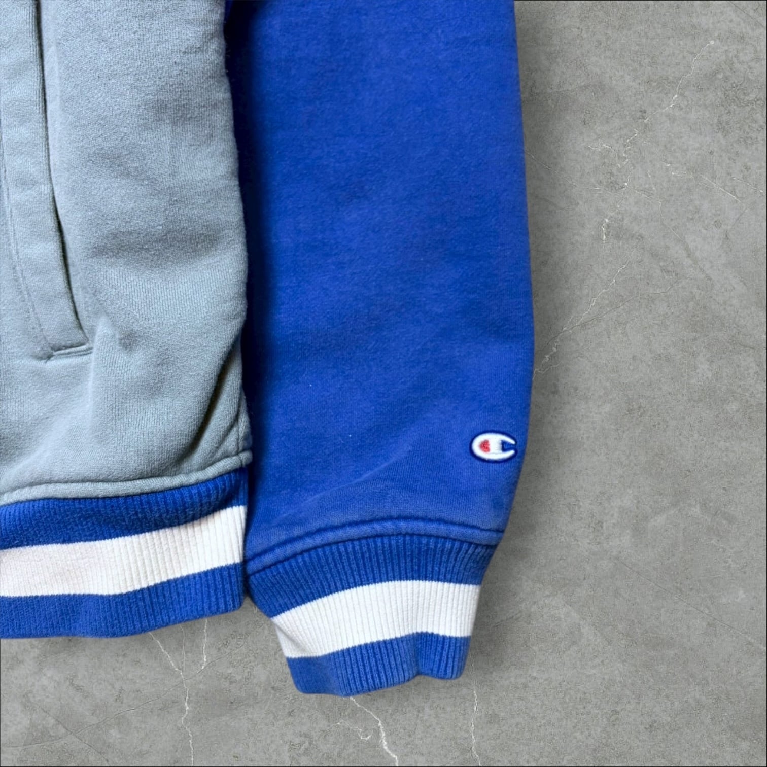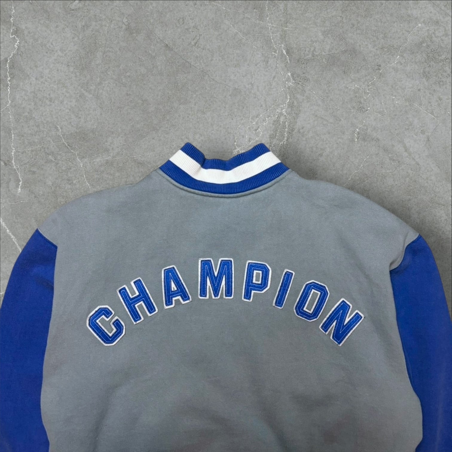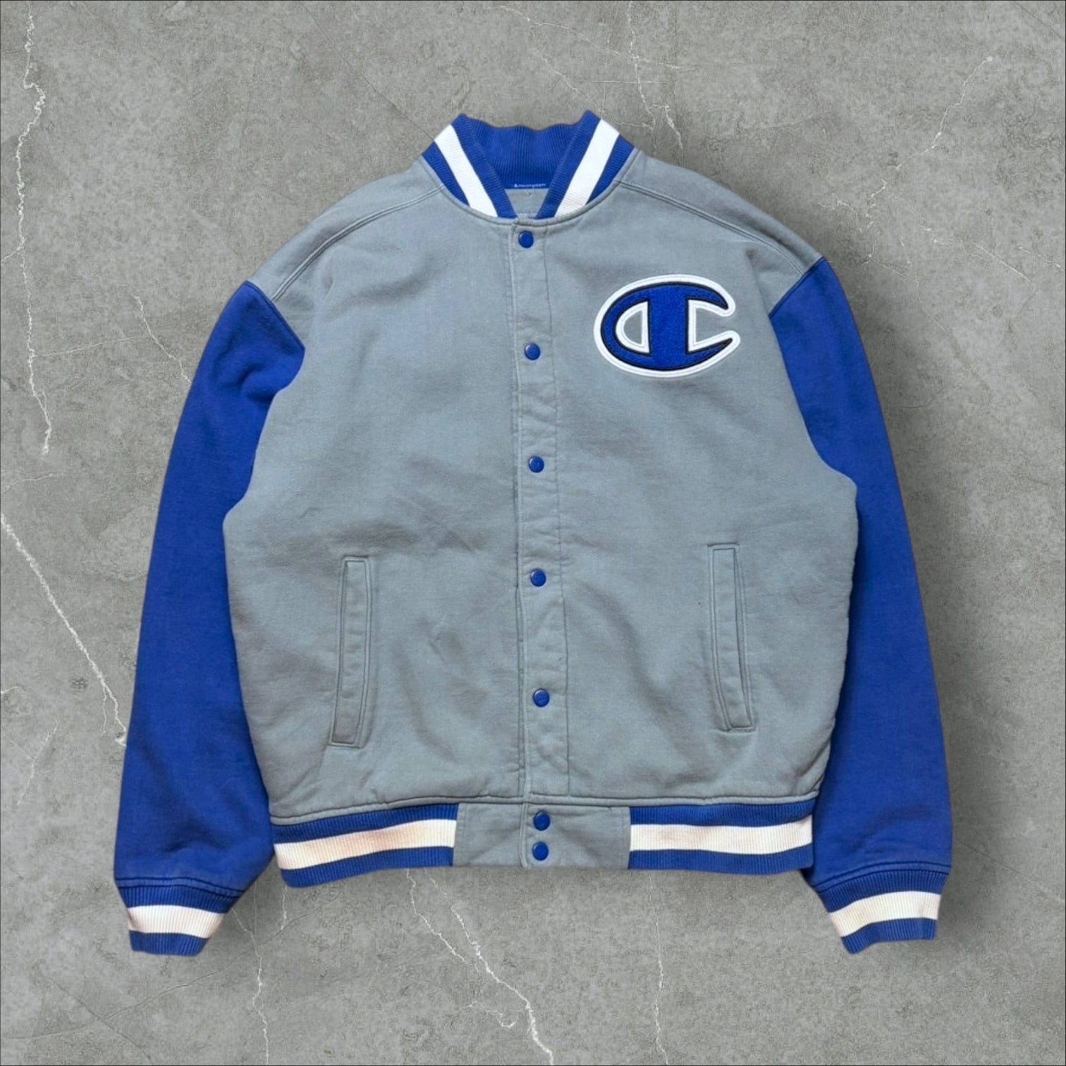 00's Champion SuperLetterman Jacket Grey × Blue L / Champion スーパーレターマンジャケット グレー × ブルー L スウェットスタジャン スタジャン デカ目 厚手 ヘビーウェイト 西海岸