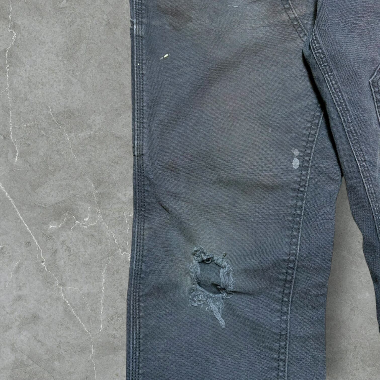 こちら、写真にございますようにお色のフェードや、リペア痕、右膝の破けなど、ダメージが数箇所にわたりございます。