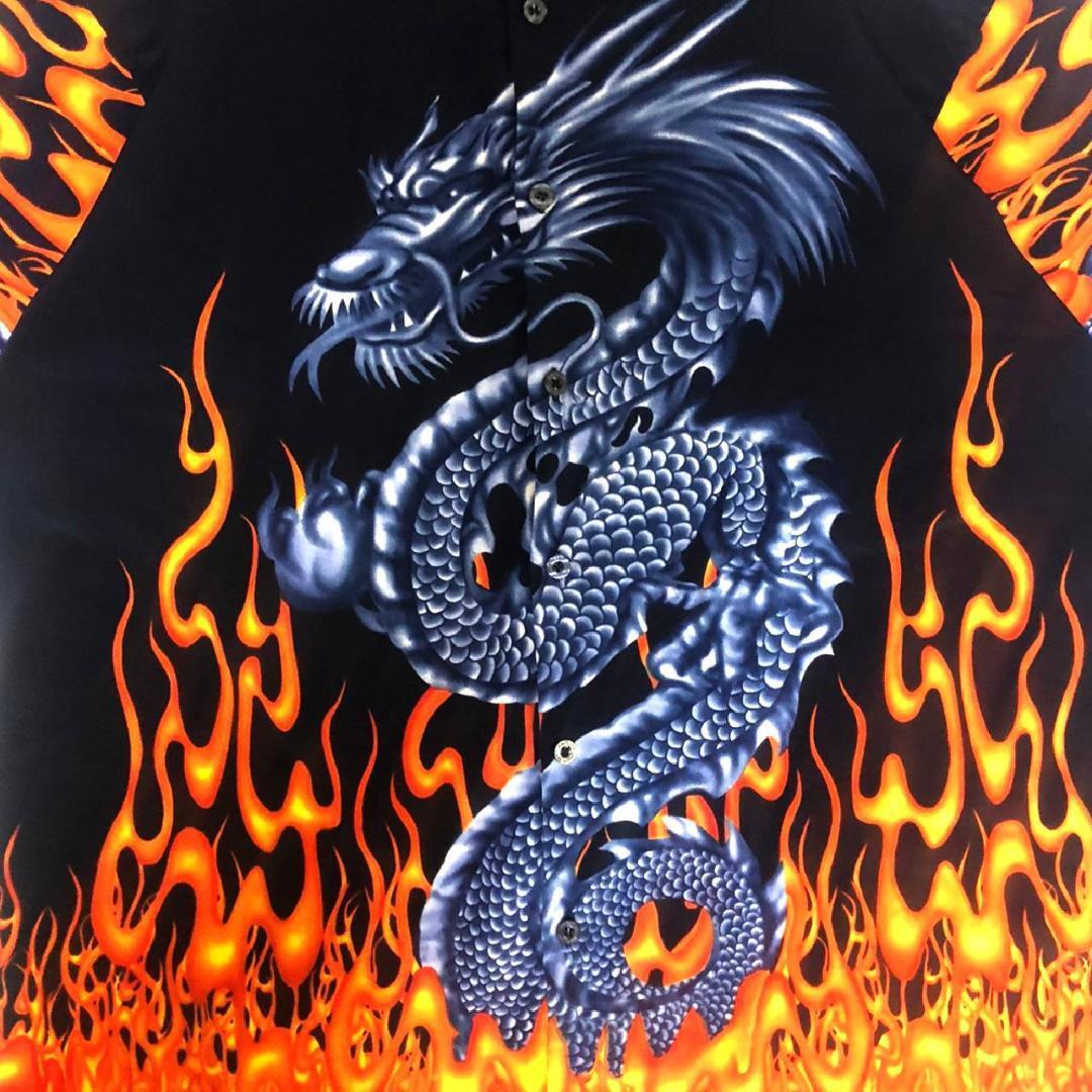 00s Amplify チカーノシャツ L ネイビー ドラゴン柄 フレイム柄 柄シャツ オーバーサイズ ストリート スケーター ヒップホップ 半袖シャツ B系 SK8 ビッグシャツ アロハシャツ 和柄 開襟シャツ オープンカラーシャツ