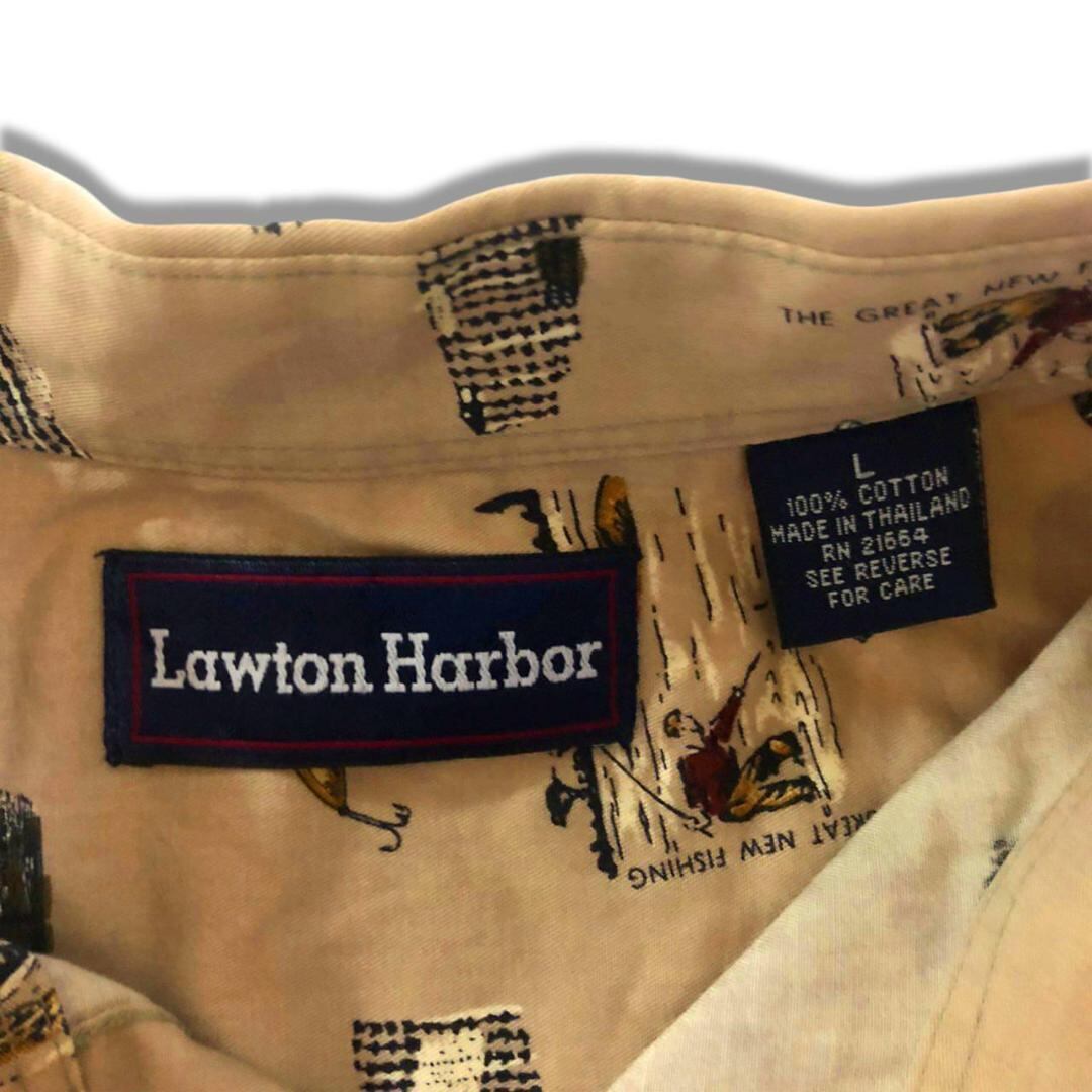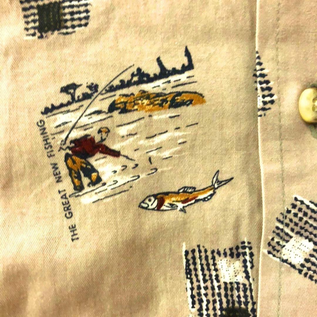 90s Lawton Harbor 釣り具総柄 長袖シャツ L ベージュ古着 ビッグシャツ 柄シャツ ビッグサイズ お魚柄 オーバーサイズ 太アーム ゆるだぼ