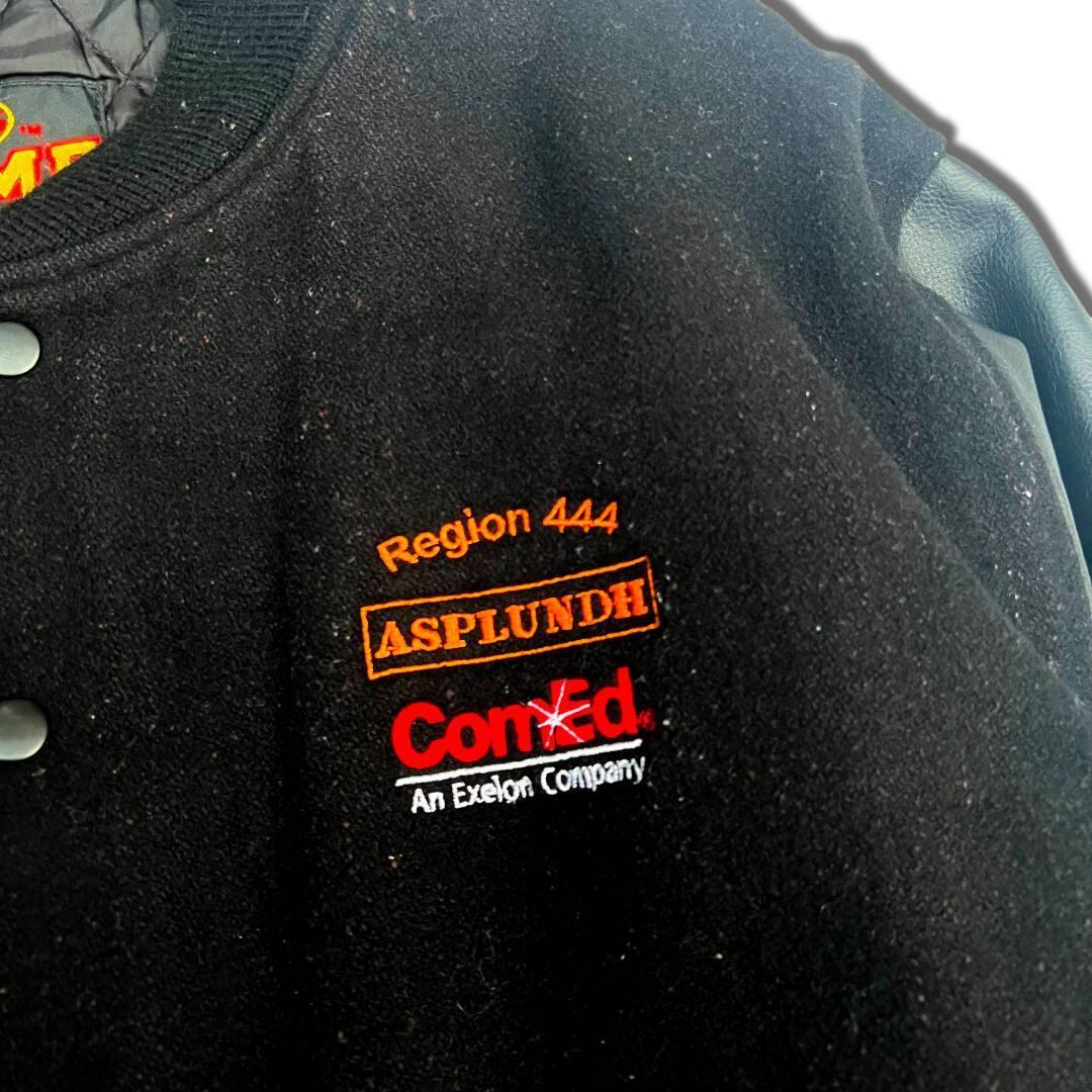 90s GAME 袖レザー スタジャン ブラック L スタジアムジャケット アワードジャケット 袖革スタジャン 刺繍ロゴ 企業ロゴ レトロ 古着 女子