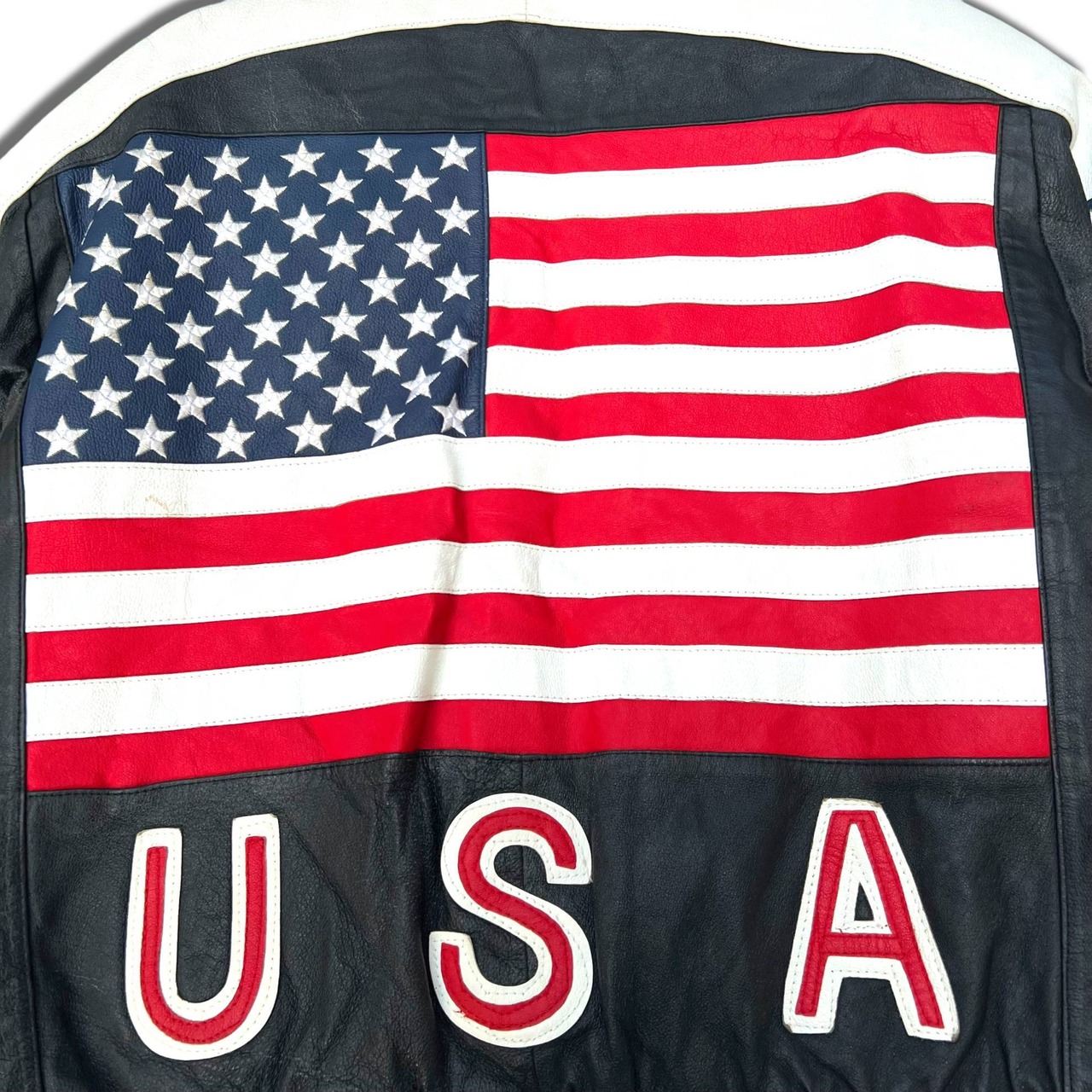 レザーと刺繍で表現された極大のフラッグ柄のバックスタイル